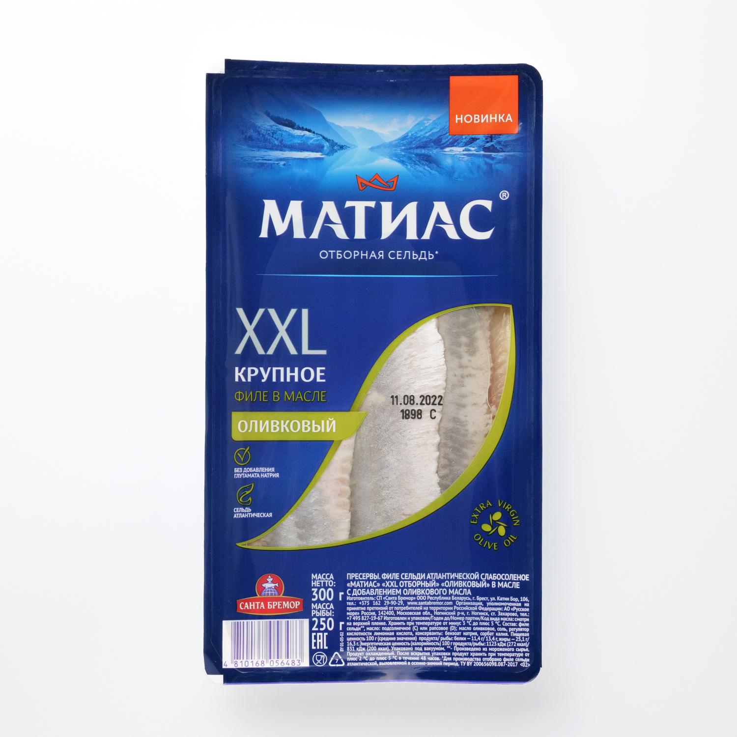 Herring fillet "Matias" XXL in olive oil contains large fat herring fillets in the package. It has a delicate texture and pleasant aroma.