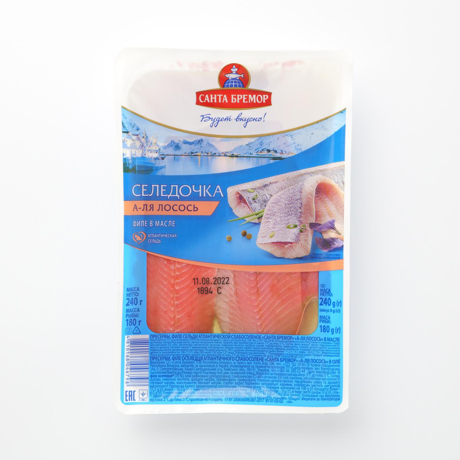 Lightly salted Atlantic herring fillets in vegetable oil from the brand "Santa Bremor". The fish has a bright red color and in appearance imitates the meat of salmon. Beautiful, juicy and fragrant fish is a wonderful decoration of your festive table or a colorful component of salads and appetizers. Enjoy the exquisite taste and freshness of the lightly salted filet of Atlantic herring "Santa Bremor".