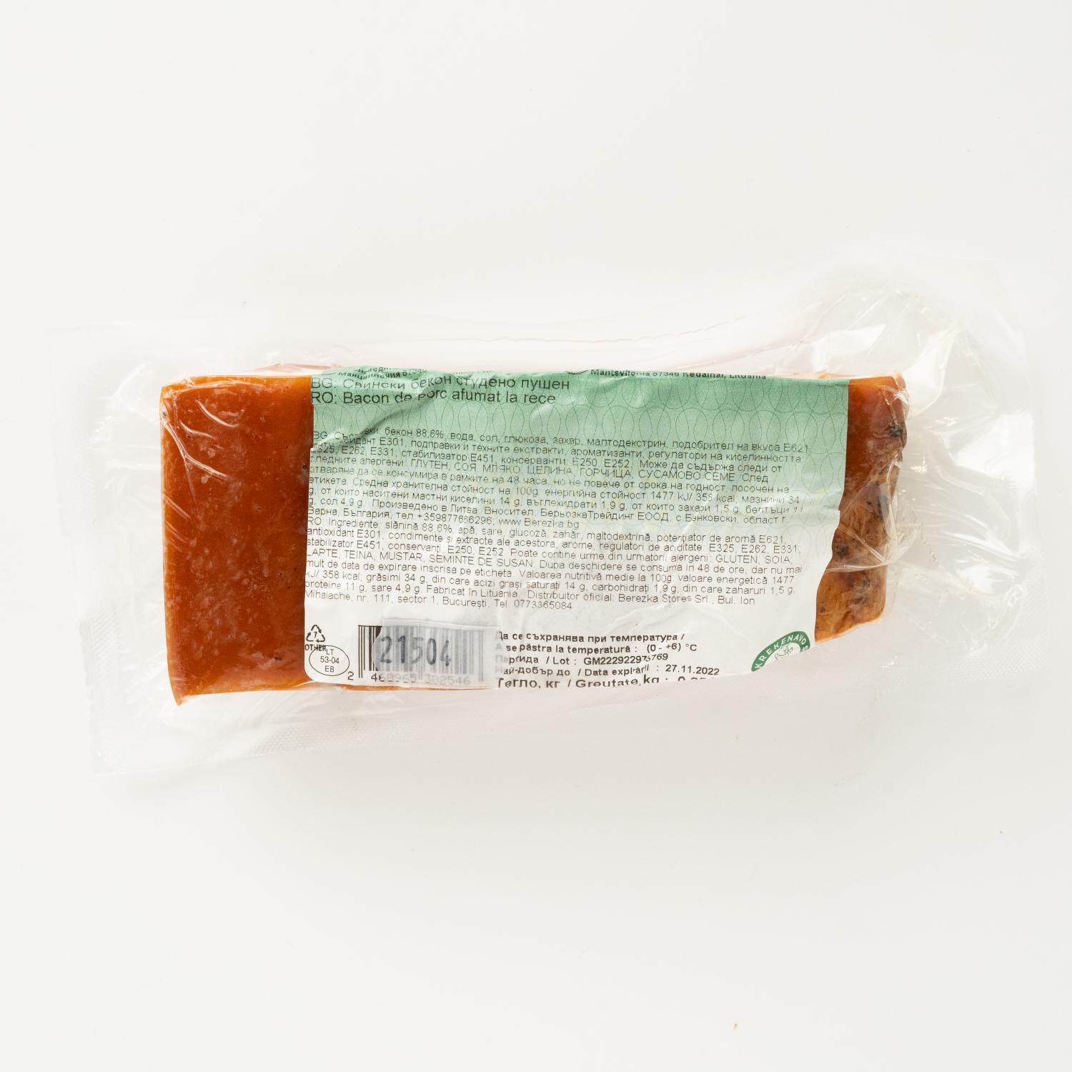 Cold smoked bacon "Krekenavos" has a delicate texture of meat mixed with veins of lard and an incredibly attractive smoky flavor. It has a refined rich taste with smoked notes. It's a great breakfast and a perfect snack. Moreover, bacon contains fatty acids, minerals and a multivitamin complex. Regular consumption of bacon helps control hormone levels, improve liver and gallbladder function, get rid of toxins and radionuclides.