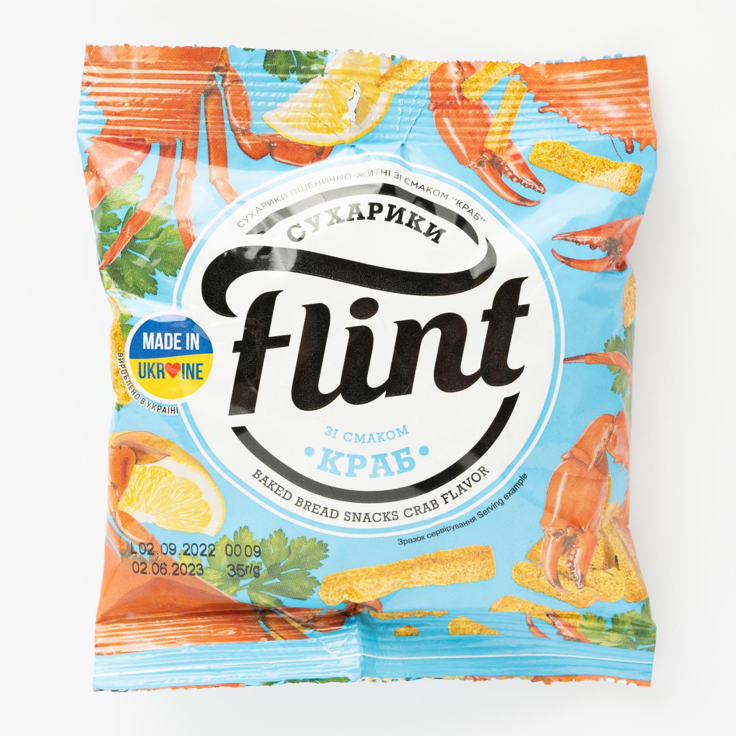 "Flint" croutons with crab are crispy, with flavorful toasted crust and bright crab flavor. For more than 20 years the brand has been the leader in the croutons market and can boast of the whole production cycle. Wheat and rye bread croutons are made from natural bread. Modern design and bright flavors, where everyone will find something to their liking.