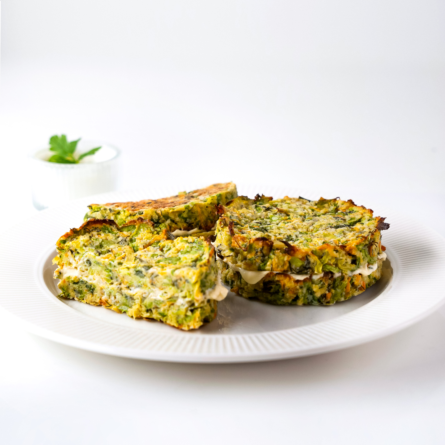 Initially, you'll experience the slightly crispy crust of the patties, transitioning into a soft and succulent blend of zucchini and carrots, with a subtle vegetable taste. Then, you'll discover the filling of garlic mayonnaise, adding a deep and rich flavor with a mild spicy note of garlic.