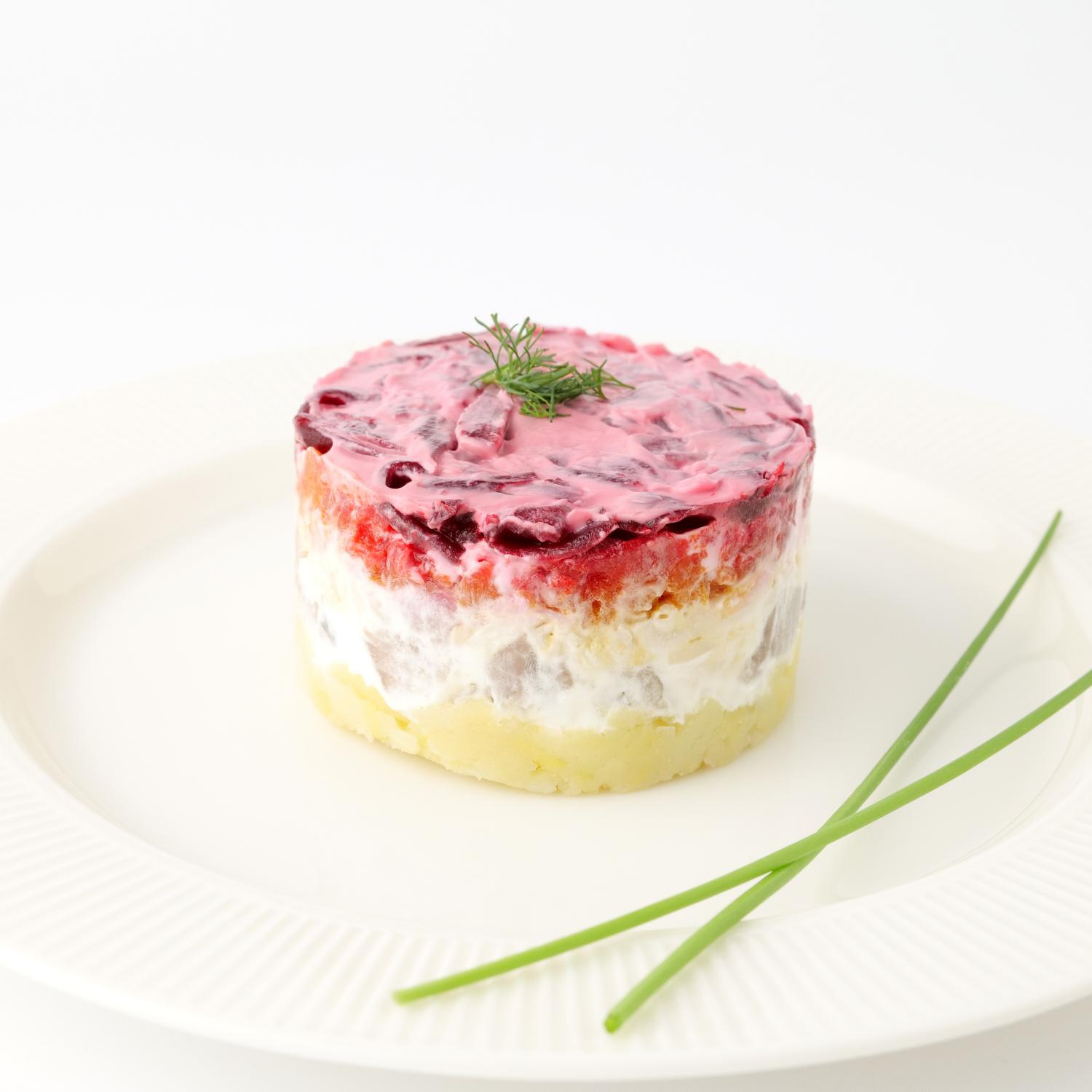 The famous salad cooked according to a classic Russian recipe, made of lightly salted herring fillets, boiled potatoes, eggs, sweet beets and juicy carrots. All the layers of the salad are beautifully stacked on top of each other and smeared with milk mayonnaise.