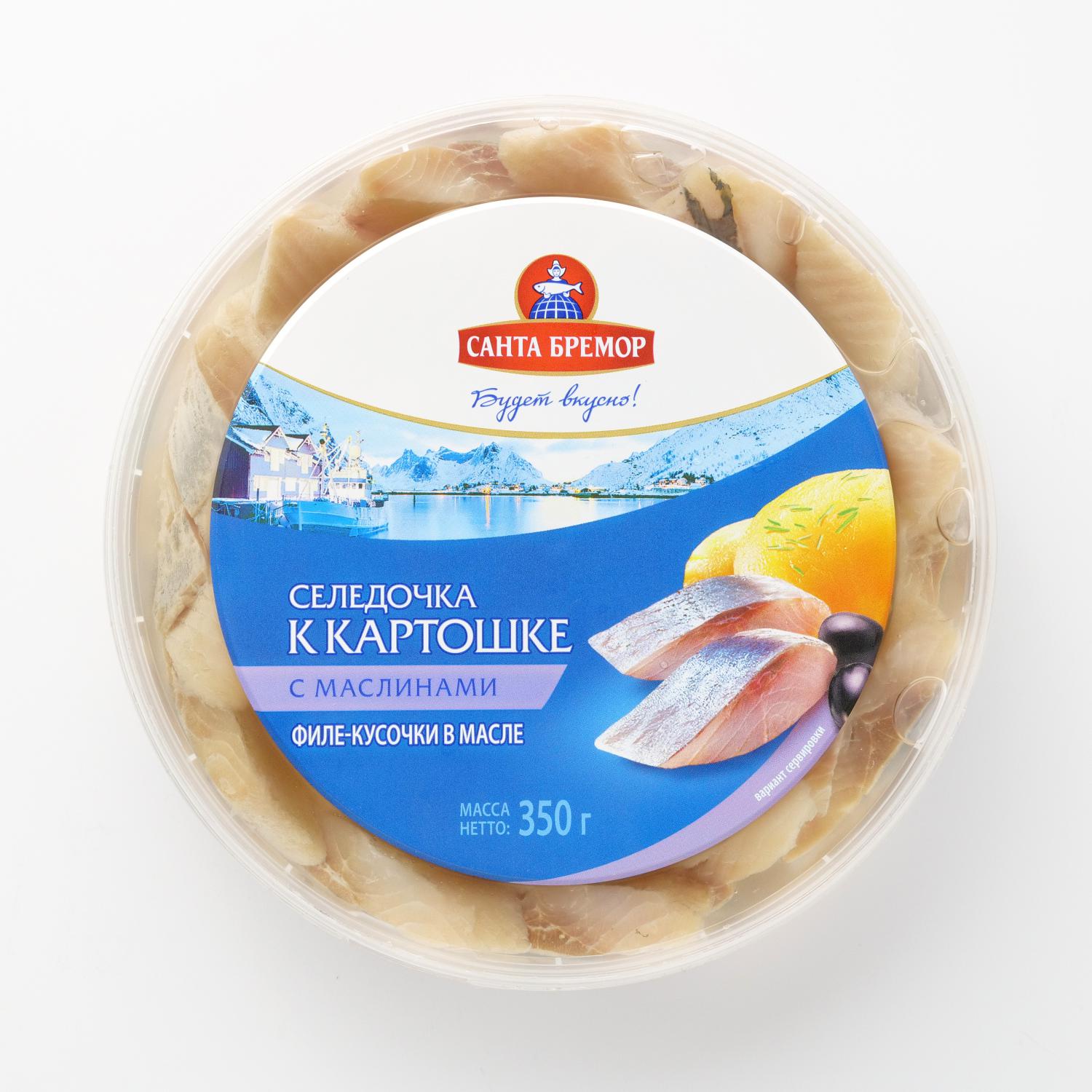 File de hering atlantic cu măsline de la producatorul „Santa Bremor” are un volum de 350 g. Bucatele delicate și moi ale peștelui se combină perfect cu uleiul vegetal și cu maslinele negre, formând un gust dulce-acrișor. Acesta este perfect pentru garnitura de cartofi fierți și poate fi servit și ca o gustare delicioasă la băuturi alcoolice.