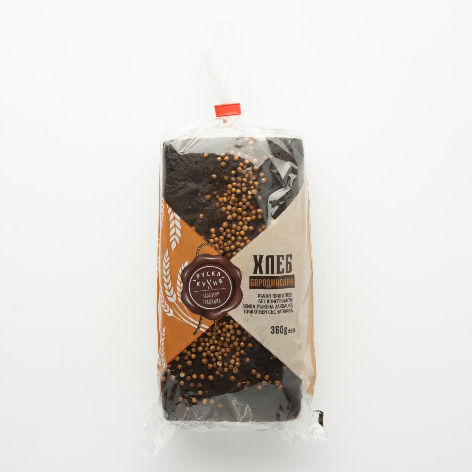 Adevărata „pâine Borodinsky” este preparată dintr-un amestec de făină, malț de secară, coriandru și chimen, care se toarnă cu apă fierbinte. Scopul este ca aluatul să se îndulce în mod natural. Pâinea noastră este făcută numai din făină de secara, fără adaos de făine de grâu. În mod tradițional, în pâinea dreptunghiulară adăugăm semințe de coriandru, care îi dau acesteia o aromă unică. Datorită drojdiei naturale și proprietăților făinii, pâinea se păstrează pentru o lungă perioadă de timp. Recomandăm consumul de „pâine Borodinsky” cu slănină afumată sau sărată, pește marinat, precum și pentru un sandviș cu caviar roșu natural. Este, de asemenea, un produs de post indispensabil.