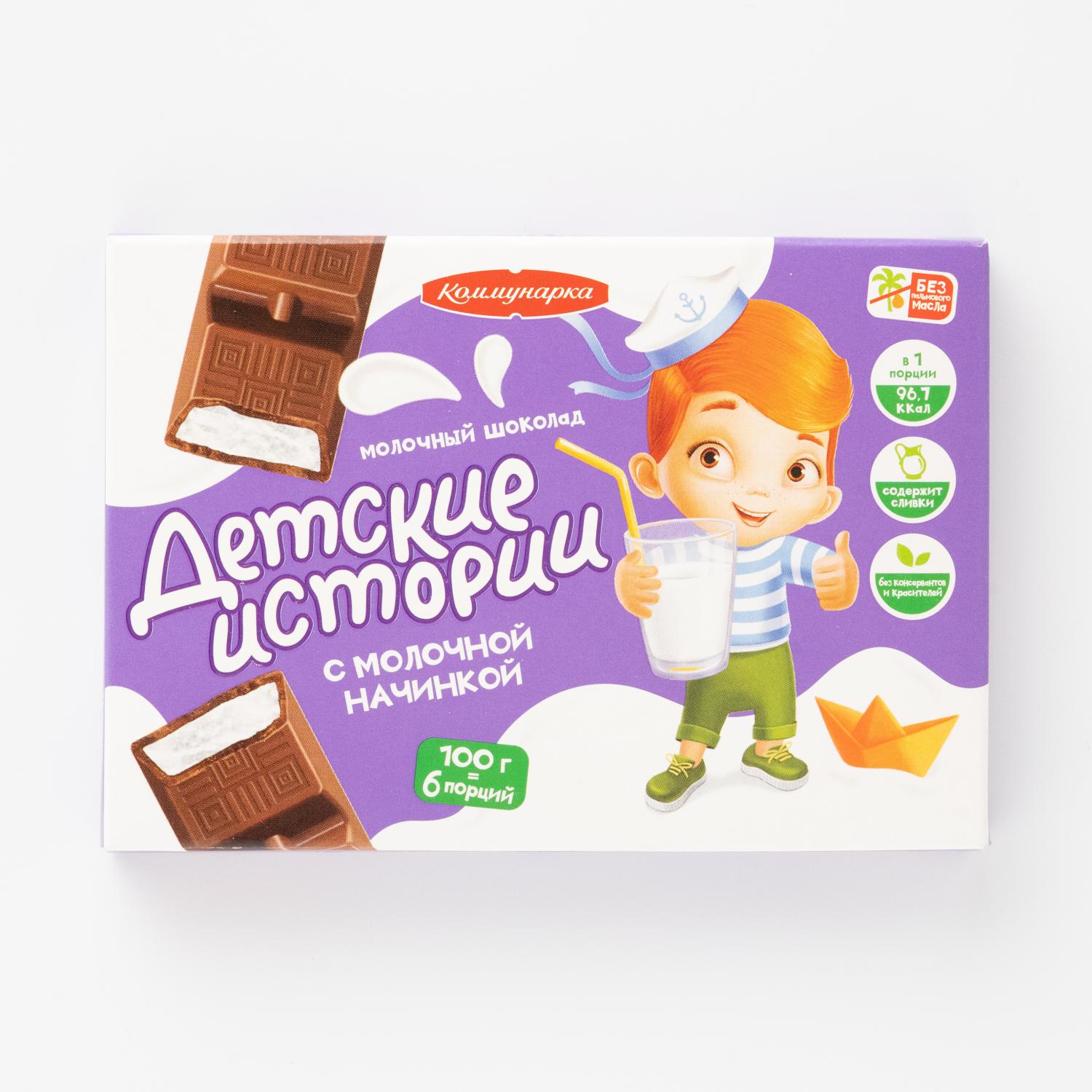 Ciocolata "Povești pentru copii" de la marca "Komunarka" este o combinație de ciocolată cu lapte și umplutură delicată de cremă de lapte.