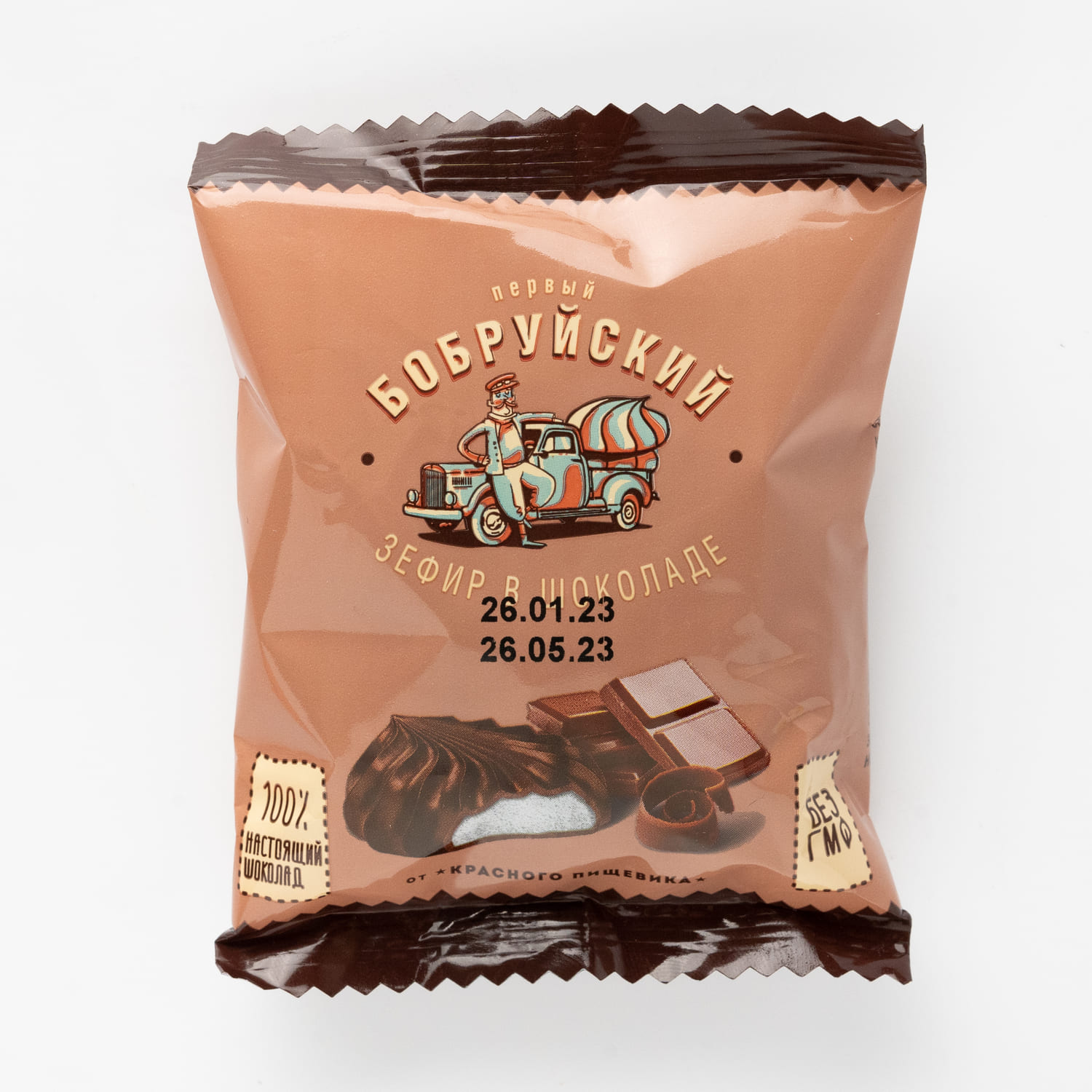 Zefir „Первый Бобруйский Ванилен în ciocolată” este un produs al producătorului belarus Красный Пищевик. Este disponibilă într-un ambalaj individual, cu o greutate de 32 de grame.