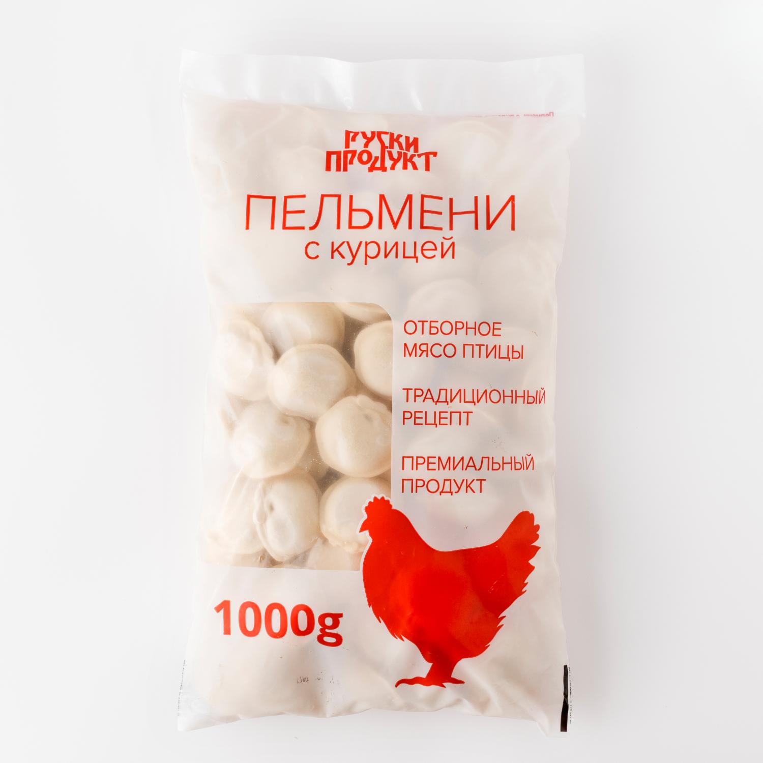 Pelmeni de la marca comercială „Ruskiy product” se prepară după o rețetă siberiană: umplutura suculentă de pui combinată cu un srop de condimente, sunt învelite într-un aluat rulat subțire. Pelmeni cu pui sunt mai usoare decât cele cu vită și porc. Pentru a le oferi acestora un gust mai pronunțat, bulionul trebuie sărat și presat cu condimente. La servire, puteți pune o lingură de smântână sau muștar. Cantitatea ambalajului este de 1 kg.
